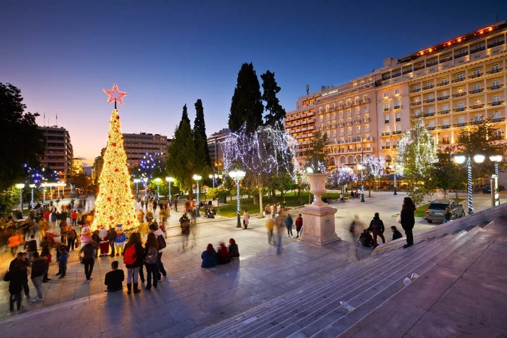Athènes réserve toujours un accueil grandiose pour Noël. Les places et les rues centrales illuminées résonnent de musique et de gaieté. Tous les coins de la ville – ses hôtels, ses magasins, ses cafés et ses restaurants – sont parés de milliers de lumières de fées scintillantes. La place Syntagma, avec son arbre de Noël étincelant, son carrousel et ses autres manèges pour enfants, ses stands de confiserie et ses nombreuses manifestations, met toute la ville dans l’ambiance des fêtes. Le Jardin national se transforme en un pays de rêve et de découverte qui enchante petits et grands.